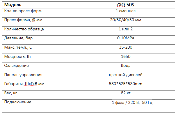 ZXQ-50S - высокопроизводительный автоматический электрогидравлический прессы, c прочным байонетным затвором обеспечиваeт быструю и безопасную работу. ZXQ-50S оснащен электрогидравлическим приводом, и не требует сжатого воздуха. Образец извлекается очень плавно и быстро. Все гидравлические компоненты расположены в эргономичном корпусе. После нажатия кнопки "Старт" запускается автоматический цикл запрессовки по выбранным параметрам. Общее время запрессовки составляет не более 5-6 мин. Все параметры: давление, нагрев и охлаждение, автоматически контролируются на протяжении всего времени работы. Параметры могут быть изменены или скорректированы Оператором во время работы пресса. Возможность запрессовки 2 образцов в одной форме при помощи проставочного диска. ZXQ -50S поставляется с комплектом сменных пресс-форм диаметр 20, 30, 40 и 50 мм. Все пресс-формы могут быть быстро и легко заменены. Изолированная закрытая конструкция защищает Оператора.
